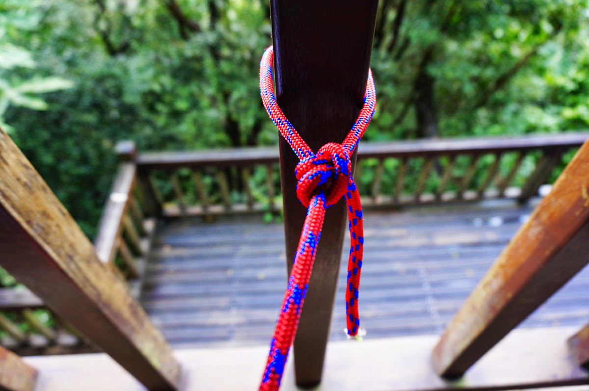 繞過柱子後拉緊不動後,將繩子一圈圈繞緊,繞緊後就不怕跑掉,結尾建議可以使用雙半結固定住,整理剩餘繩子,完成主繩架設。